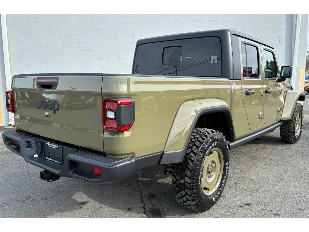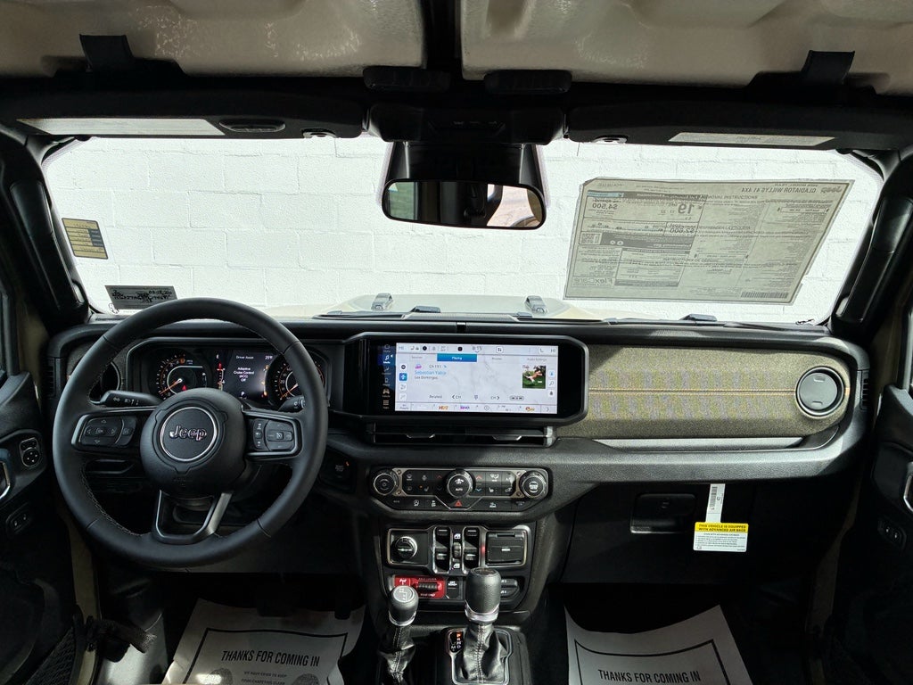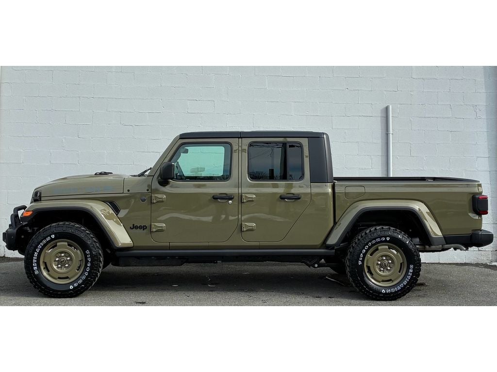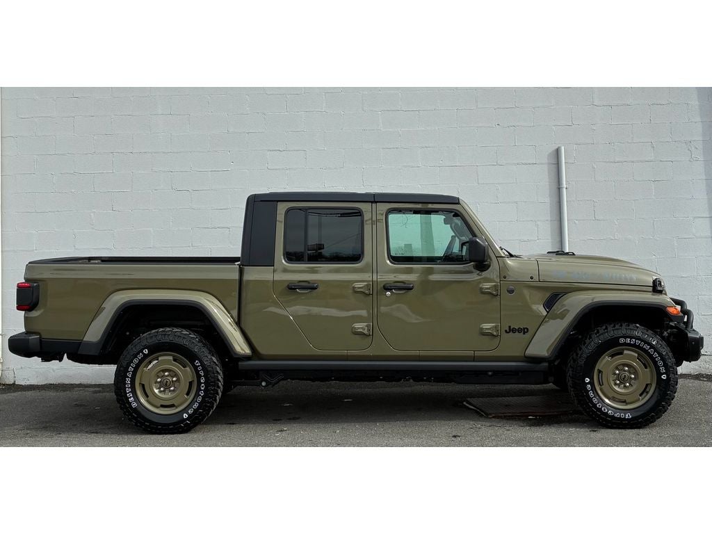 Convenience Group: Emergency/Assistance Call; Front Door Locks 2-Door Passive Entry; Remote Start System; Cluster 7.0" TFT Color Display; Universal Garage Door Opener; Daytime Running Lamp System; Heated Front Seats; Air Conditioning W/Auto Temp Control; Heated Steering Wheel; Corning Gorilla Glass. Quick Order Package 24T Willys 41: LED Taillamps; Protection Sill Rails; Willys '41 Retro Edition Gladiator Decal; MOPAR Black Hood Graphic; 4WD Willys '41 Tailgate Decal; MOPAR All-Weather Slush Mats; Willys '41; LT255/75R17C OWL On/Off Road Tires; Body Color Fender Flares (2-Piece); Front Heavy Duty Red Accent Shock Absorbers; Daytime Running Lamps LED Accents; Front LED Fog Lamps; LED Premium Reflector Headlamps; E-Locker Rear Axle; Green Soul Cloth Wrapped Mid-Bolster; Corning Gorilla Glass; Trailer Hitch Zoom; Class IV Receiver Hitch; Security Alarm; Performance Hood; Steel Front Bumper; 17" X 7.5" Fully Painted Wheels; Advanced Brake Assist; Willys Suspension; Heavy Duty Engine Cooling; Automatic Headlamps; Air Conditioning W/Auto Temp Control; 5. 950 lbs GVWR; Deep Tint Sunscreen Windows; MOPAR Triple Hoop Grille Guard; Off-Road Plus Mode; Central ADAS Decision Module (CADM); Willys '41 US Edition U.S. Hood Decal; Full Speed Forward Collision Warning Plus; Rear Heavy Duty Red Accent Shock Absorbers; Front Door Locks 2-Door Passive Entry; 97 MPH Vehicle Max Speed Calibration; Cloth Low-Back Bucket Seats; Cluster 7.0" TFT Color Display; Power Heated Mirrors; Daytime Running Lamp System; Auxiliary Switches; Premium Wrapped Steering Wheel; Sun Visors W/Illuminated Vanity Mirrors. Black 3-Piece Hard Top. 41. **Equipment listed is based on original vehicle build and subject to change. Please confirm the accuracy of the included equipment by calling the dealer prior to purchase.**