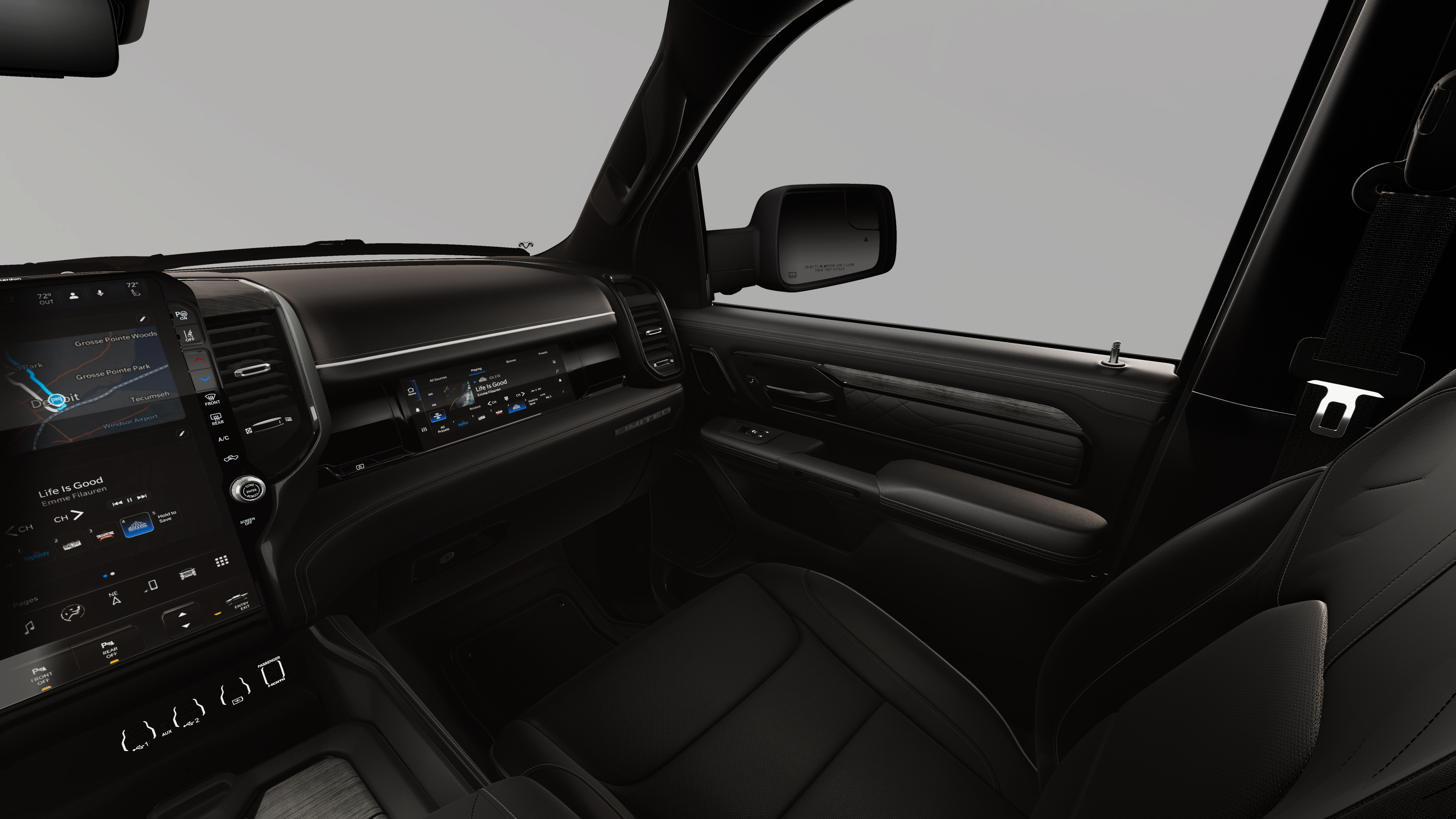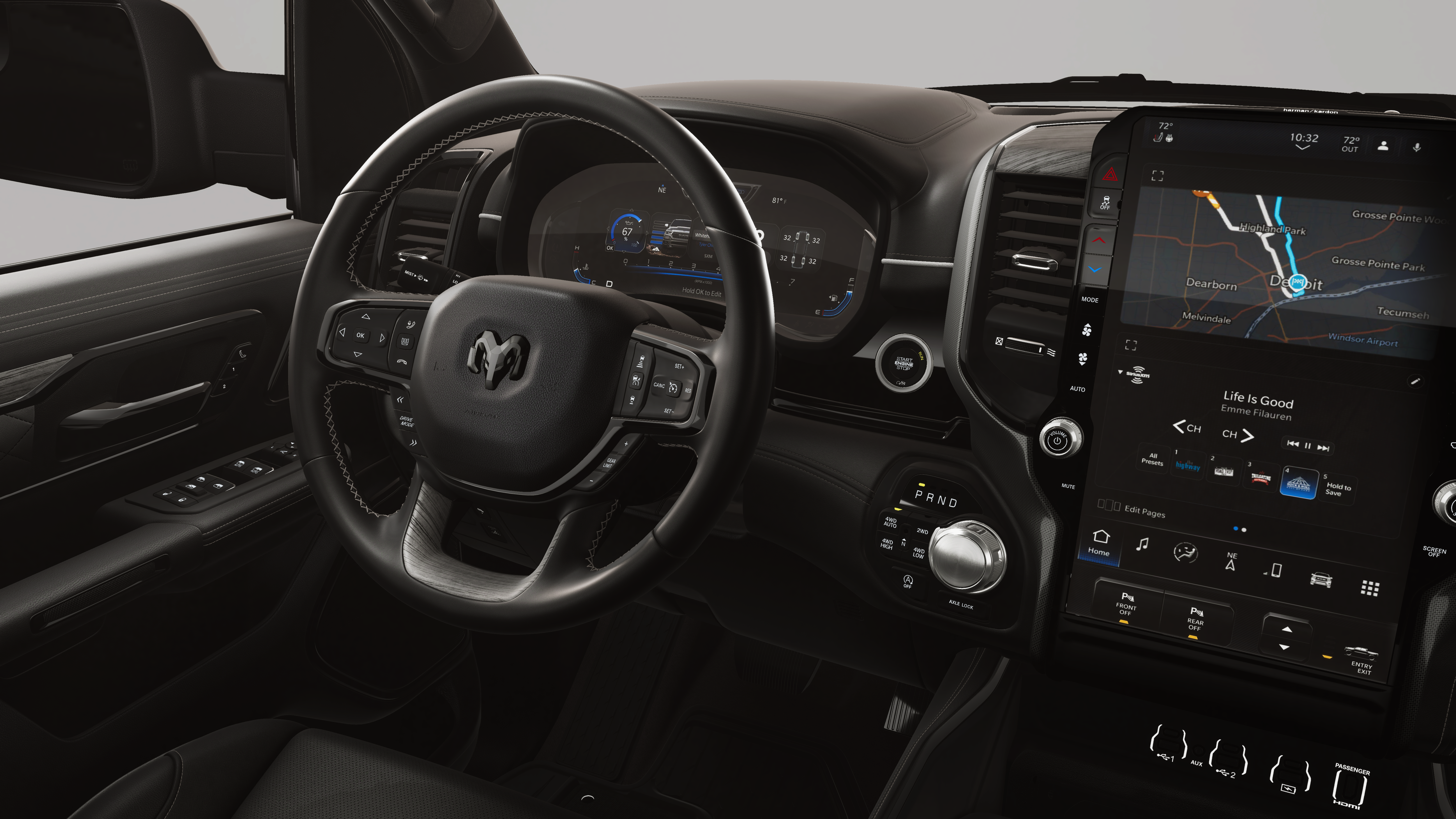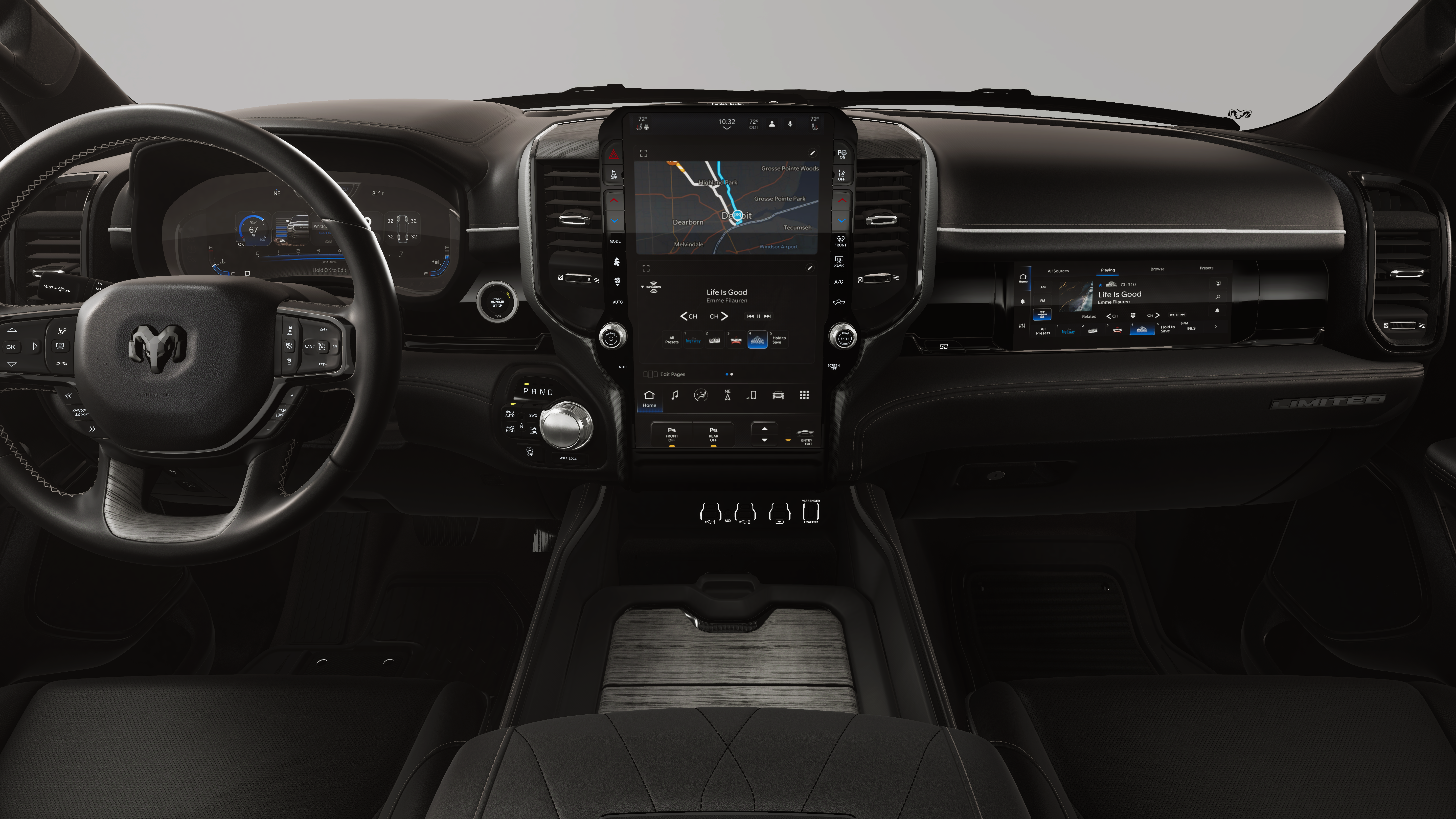 Quick Order Package 22M Limited. Bed Utility Group: Truck Bed Cargo Divider; MOPAR 4 Adjustable Cargo Tie-Down Hooks; Exterior 115V AC Outlet; MOPAR Deployable Bed Step Center Mount. Limited Level A Equipment Group: Google Android Auto; SiriusXM Radio Service; USB Host Flip; Surround View Camera System; Integrated Center Stack Radio; LED CHMSL Lamp; Tri-Fold Tonneau Cover; Integrated Voice Command with Bluetooth®; Connectivity - US/Canada; Traffic Sign Recognition; GPS Navigation; 4G LTE Wi-Fi Hot Spot; RamBox Cargo Management System; GPS Antenna Input; Hands-Free Active Driving Assist System; SiriusXM with 360L; Global Telematics Box Module; Head Up Display; Connected Travel and Traffic Services; Evasive Steer Assist; Drowsy Driver Detection; Exterior 115V AC Outlet; Intersection Collision Assist System; Apple CarPlay; Disassociated Touchscreen Display; HD Radio; Smartphone as a Key Capable; 14.4" Touchscreen Display; Uconnect 5 Nav with 14.4" Display; 240 Amp Alternator; Digital Rearview Mirror; 12-Way/1-way Trailer Connector. 22" X 9" Premium Paint/polished Wheels. Dual-Pane Panoramic Sunroof. Multi-Function Tailgate. Tri-Fold Tonneau Cover. E-Locker Rear Axle. Granite Crystal Met CC. **Equipment listed is based on original vehicle build and subject to change. Please confirm the accuracy of the included equipment by calling the dealer prior to purchase.**